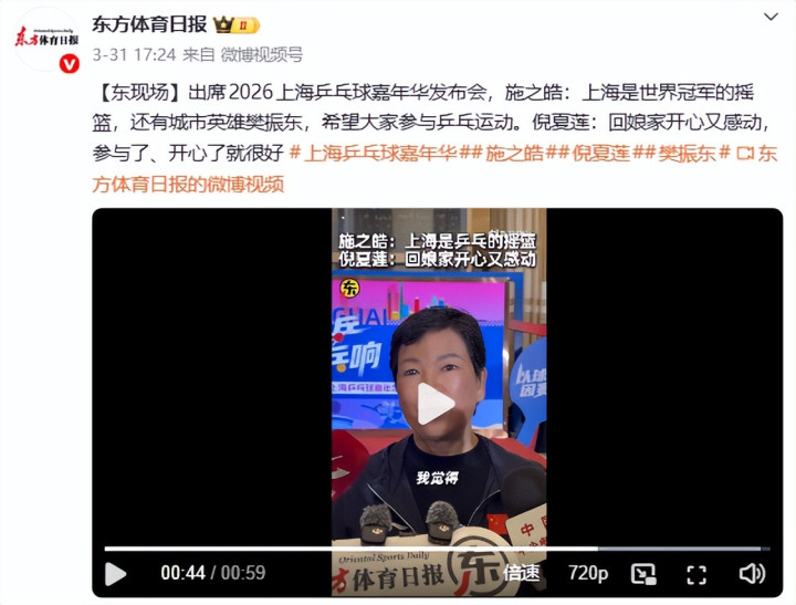 作为上海市社区体育协会会长,施之皓在发言中提到了樊振东。