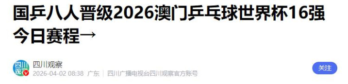 四川观察|国乒八人晋级2026澳门乒乓球世界杯16强 今日赛程→