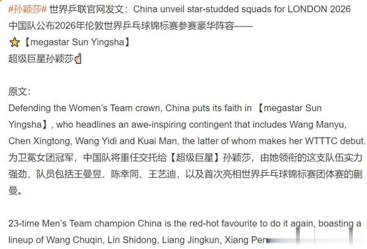 2026年4月28日,伦敦团体世乒赛就要开始了,中国女队作为头号种子出征卫冕。在WTT官网的中国女队阵容介绍中,megastar这个英文词尤其显眼。孙颖莎是本届赛事中唯一一个被称作超级巨星的运动员。