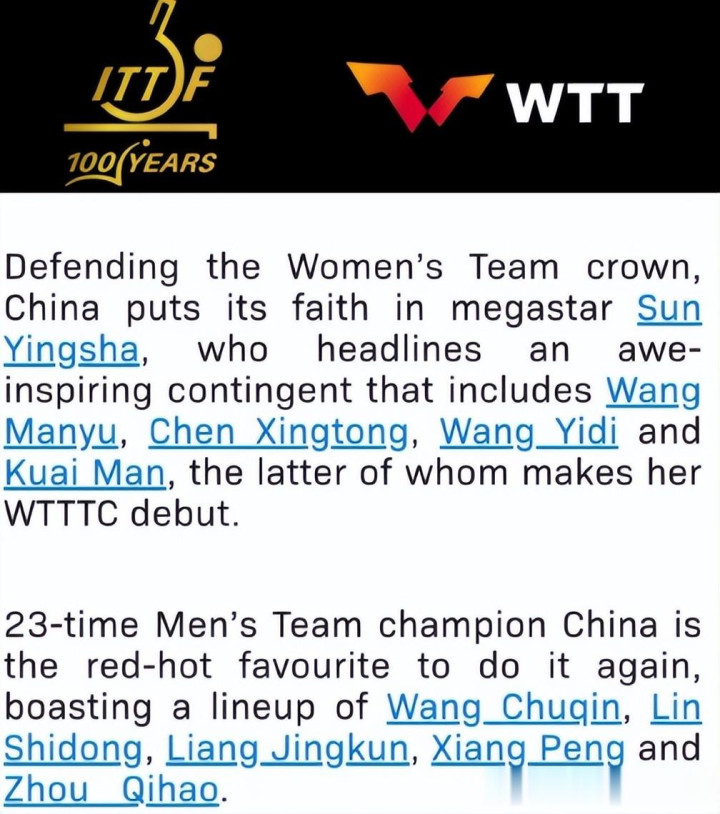 WTT世界乒联官网发文表示,中国队把卫冕女团冠军的重任交给超级巨星孙颖莎,由她带领的队伍实力强大。这是对孙颖莎近年来统治力的表现的真实描述,并不是溢美之词。
